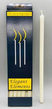 Set of 6 ivory extra long chime/taper candles. These elegant element candles are sure to make a statement along with extra burn life. 10″ and fits 1/2″ holders.