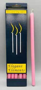 Set of 6 pink extra long chime/taper candles. These elegant element candles are sure to make a statement along with extra burn life. 10″ and fits 1/2″ holders.