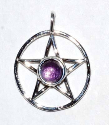 Sterling Silver Pentacle with Amethyst Pendant The pentacle is a five pointed star inside a circle. The five points represent the five elements; fire, air, water, earth, and spirit. 18mm diameter with 5mm Amethyst gemstone.