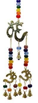 Bright and cheery Om brass windchime, created with chakra-colored beads. Complete with 3 Om symbols and an array of bells. Size is approximate