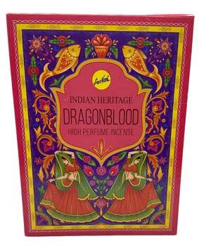 Golden India Dragon Blood stick incense. Beautifully packaged box containing approximately 15 premier quality high perfume incense sticks. From India and free from chemicals and toxic agents.12 individual boxes per case.