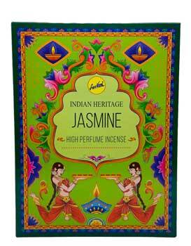 Golden India Jasmine stick incense. Beautifully packaged box containing approximately 15 premier quality high perfume incense sticks. From India and free from chemicals and toxic agents.12 individual boxes per case.