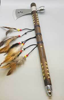 This is a decorative/ceremonial Tomahawk prayer pipe. This is a large 19″ feathered piece with a wooden handle. Not for outdoor or camping use. WARNING: This product can expose you to chemicals which are known to the State of California to cause cancer or other reproductive harm. For more information go to www.P65Warnings.ca.gov. Cannot ship to MA or CA.