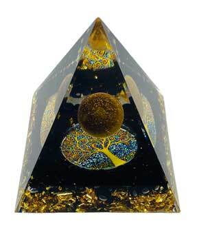 An Orgone pyramid with a soft moon hovering over a colorful tree of life. An orgonite pyramid is a device, which consists of epoxy resin, metals of different density, crystals and minerals. Orgonite has powerful energy and protects against negative events that have physical and energetic nature. A beautiful way to protect your precious energy. Approximately 2 1/2″ tall