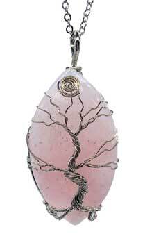 The detailed wire wrapping creates a tree of life design around the Rose Quartz crystal. Pendant measure 2″ and hung on a 20″ silver toned chain. Sizes may vary slightly.