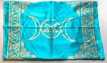 Triple moon altar cloth has a turquoise background with a shimmering gold design. These are excellent for your altar, hung ornamentally or as a small scarf accent. The energy of the triple moon phases is for every aspect: for help, bounty, and awareness. 100% rayon 21″ x 21″ not perfectly sq.