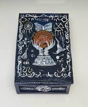 Magickal Spell Tarot Box, Great for holding Tarot Cards and anything else! Great details and colors throughout. 5 1/2″ x 3 3/4 x 2 inches Hand Painted Cold Cast Resin.