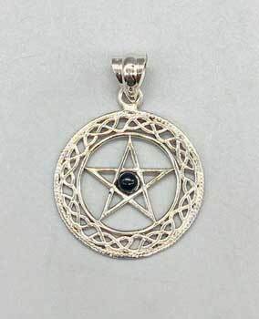 A Pentagram sits in the center surrounded by a beautiful Celtic knot design. Sterling silver marked .925 with an a Black Obsidian stone in middle. Hangs approximately 2 3/4″ with a width of 1 1/4″. We have matching earrings to go with this pendant as a nice set click here