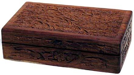 Handcrafted of wood, this box is perfectly sized for holding your tarot deck, herbs, or ritual tools, and features surfaces carved with intricate floral designs. 8″ x 5″ x 2 1/4″