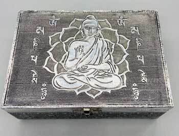 Keep wooden sake box created with a fabulous metal designing. The attractive details are on the cover and all around this special box. Lined with a soft velveteen to keep your items safe within. Latch closure and measuring 5″ x 7″. Buddha symbol