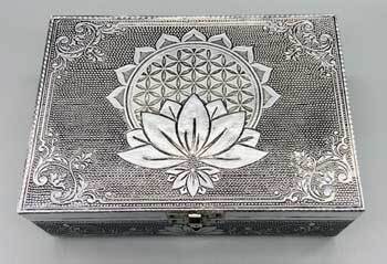 Keep wooden sake box created with a fabulous metal designing. The attractive details are on the cover and all around this special box. Lined with a soft velveteen to keep your items safe within. Latch closure and measuring 5″ x 7″. Flower of Life with a Lotus.