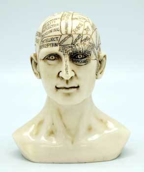 This antiqued human head has distressed words, symbols and mapped areas relating to the pseudoscience of Phrenology.