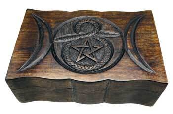 This is a large wooden box carved with an ornate triple moon, pentagram and cobra snake. Approximately 6″ x 9″