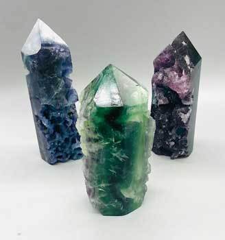 Beautiful polished Fluorite obelisks displaying one side in a raw natural form and the other side is polished. Lots of interesting details and unique energetic offerings with each piece. Fluorite may assist you with bone health, organ function, dexterity, balance, self-worth, new ideas and inspiration. Seen in image is an example of one you may receive and sold individually. Each one being unique in size, shape and coloring. Approximately .70lbs – 1.2lbs and from China