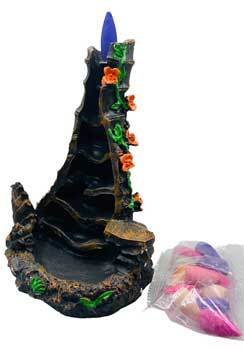 Backflow cone burner with a waterfall design . Handmade Ceramic Backflow Cone Burner. Smoke travels downwards forming a waterfall effect. Must use backflow cones to achieve results. Handmade ceramic backflow cone burner with an antique gloss finish. 7.5″H x 5″W