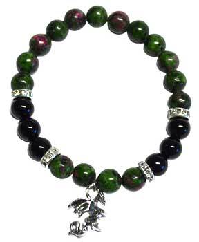 This ruby zoisite and black onyx bracelet is highlighted with faceted pieces. (Ruby zoisite is a dyed stone (syn)). It is accented with a pewter Dragon. Elastic cord. One size fits most.
