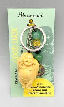 Carry this key chain with you to attract the good luck of the happy Buddha. Handmade with the most powerful stones to bring abundance and inner security into your life. They will draw the luck energies to work towards your goals and dreams. Good Luck keychain made with Green Aventurine, Citrine and Black Tourmaline. 3 1/4″ sizes may vary slightly.