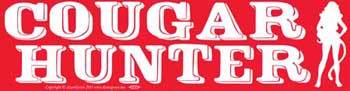 Printed in bold white lettering against a red background, next to a curvy female form that possesses a feline tail, this bumper sticker reads “Cougar Hunter.”