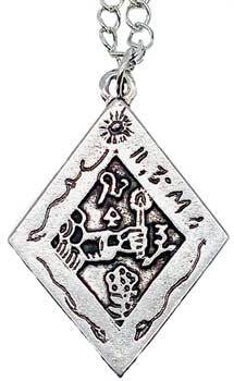 This is a silver toned discover treasures pendant. Attached to a 22″ chain with pendant measuring 1 1/2″ sizes may vary