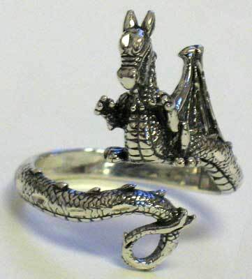 This wonderful ring presents the image of a dragon rearing back in an almost playful fashion, with the dragons tail actually forming the ring. Made of sterling silver,