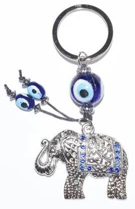 Keep your keys safe on this keychain. Blown glass evil eyes watch along with a bejeweled elephant. 4 1/2″ overall.
