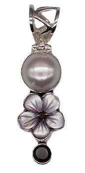 A beautiful trio of energy beaming from this high-quality piece. A fresh water pearl sits on top of the flower made from Abalone shell. Smoky Quartz completes this pendant with a piece below the flower and in the center. Sterling silver and hanging approximately 2″ with a 1/2″ width
