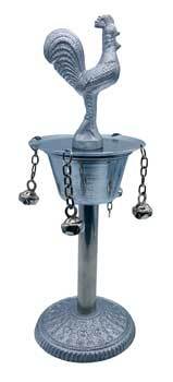 Osun takes the form of the roaster perched on a cup that sits on a pedestal. This Santeria tool stands almost 10″.