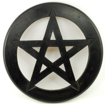 This wall hanging has been carved from a solid piece of wood and stained black, and displays the five pointed star of a Pentagram; an ancient symbol of mysticism. Hanger bracket is flush to allow for flat use on table or hanging on wall. Hanging bracket is metal 3/8″ slotted.