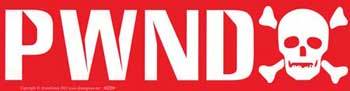 Printed in white upon a red background, this bumper sticker reads “PWND” with a skull and crossbones right next to it.