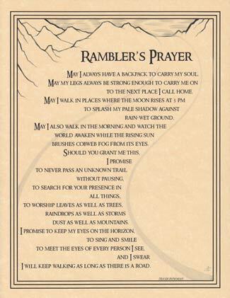 The Rambler’s Prayer poster offers you a touching prayer perfectly suited for seeking strength and guidance if you are one who’s heart is at home wandering through life. 8 1/2″ x 11″.