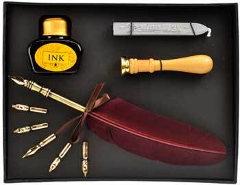 A stunning writing set for formal writing, calligraphy or spell & ritual work. Comes with a feather writing quill, six interchangeable tips, ink pot, sealing wax candle with pure cotton wick and a hand seal. The hand seal features an interwoven pentacle and crescent moon. The brass stamp on the hand seal can be unscrewed from the wooden handle and can be swapped with all of the stamp heads from our Spiritual Sealing Wax Kit (Item code : BSWSPI ) and our Sealing Wax Refill Kit (Item code: BSWREF ) is an excellent way to get more sealing wax for your formal writing needs.