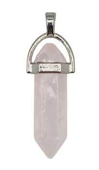 Rose Quartz pendant with a double termination allowing the healing energy to flow in both directions. 1 1/2″ long with silver toned hardware. Cord not included