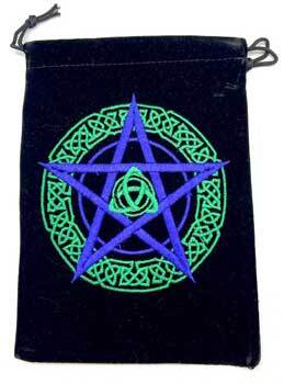 This is a black velveteen pouch embroidered with a Pentagram. Use for storing charms, crystals, runes, talismans or for your next creative project 5″ x 7″ and sold in a set of 10.