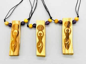 A set of 3 Palo Santo pendants that are wood burned with the Goddess on the front. This sacred wood is used to help clear negative energy with its amazing purifying properties. The lovely scent of this “holy wood” will also help ease any stress you may be experiencing. Set of 3 pendants with wooden and amethyst beads strung on an adjustable cord. Each pendant will vary slightly in color, shape, and design patterns. From Peru