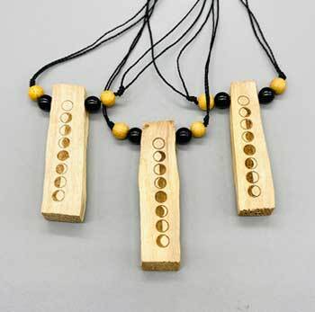 A set of 3 Palo Santo pendants that are wood burned with the Moon Phases on the front. This sacred wood is used to help clear negative energy with its amazing purifying properties. The lovely scent of this “holy wood” will also help ease any stress you may be experiencing. Set of 3 pendants with wooden and amethyst beads strung on an adjustable cord. Each pendant will vary slightly in color, shape, and design patterns. From Peru