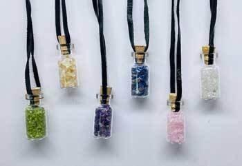 These little bottle pack some serious energy within each one. Wear around your neck or hang to receive the energy healing each piece has to offer. Set of six corked bottles with a long suede like cord. Citrine, Rose Quartz, Amethyst, Sodalite, Peridot, and Clear Quartz. 1 1/2″ glass bottle.