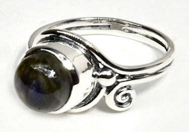 A finely handcrafted Labradorite round ring set on a lifted setting. Wonderful spiral detailing in the sterling silver and great energy from the amazing polished Labradorite. Stamped .925