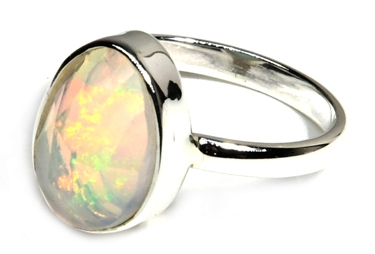Get lost in the rainbows of natural colors that dance through each special ring. Ethiopian Opal is highly praised for their incredible colors that form in a wavy texture. Stamped .925 sterling silver with the egg-shaped stone measuring approximately 1/2″ long and 3/8″ wide. Size 8
