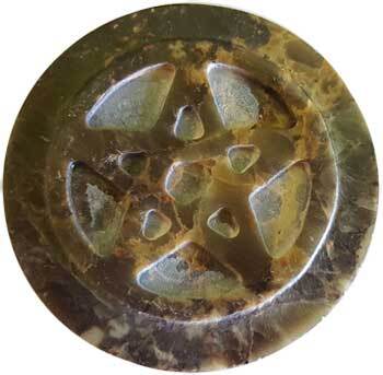 Representative of the four elements ruled by the divine, this pentagram altar tile has been lovingly carved of soapstone. Stone colors range from cream to tan, to burgundy, almost lavender, and more. Random our choice. 3″