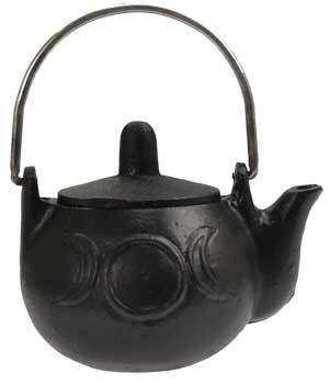 A cast iron teapot featuring a triple moon symbol on its face. Comes with lid. Suitable for any ritual purpose. Cast Iron. 4″ x 2 3/4″ x 2 3/4″